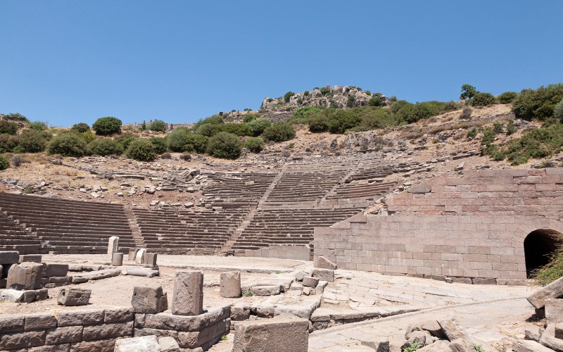 MÖ 6. yüzyıla dek uzanan Assos Antik Kenti, sönmüş bir volkanik tepe üzerine, andezit kayalıkları arasına, denizden 236 metre yüksekliğe kurulu. İlk arkeolojik kazıların 1881’de başladığı antik kentin en önemli yapılarının başında eşsiz manzarasıyla Athena Tapınağı geliyor. Arkaik Çağ’da Anadolu’da yapılan ilk ve tek dor düzenindeki tapınak, halen oldukça büyüleyici. 12 Olimpos Tanrısından biri olan Zeus’un kızı Athena, kentin koruyucu tanrıçası olarak kabul ediliyordu. Midilli Adası’na tüm görkemiyle yükselen tapınağın kutsal odasında bulunan tanrıça heykeli ise ne yazık ki, 1800’lü yıllarda Amerikalılar tarafından götürülmüş. Sütunların üzerlerindeki kabartmaların bir kısmı Boston Müzesi, Louvre Müzesi ve İstanbul Arkeoloji Müzesi’nde sergileniyor. Kabartmalarda Herakles ile ilgili bir hikâye anlatılıyor.